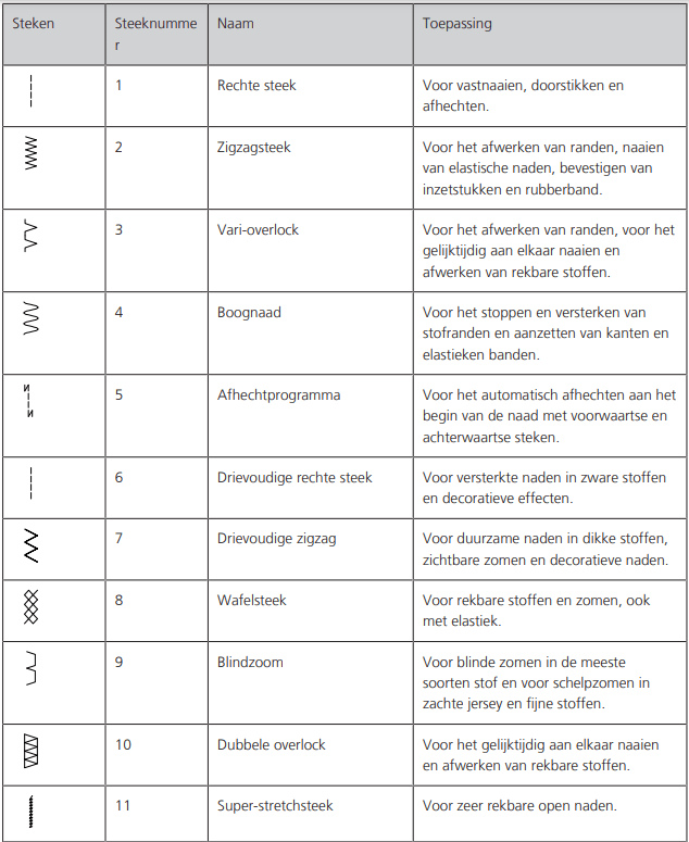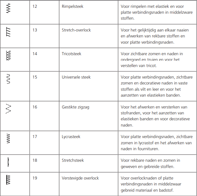 Nr. 11 de stretchsteek ook wel de rekbare steek genoemd is dus voor de rekbare stoffen zoals tricot. Een steek die men ook heel vaak gebruikt.