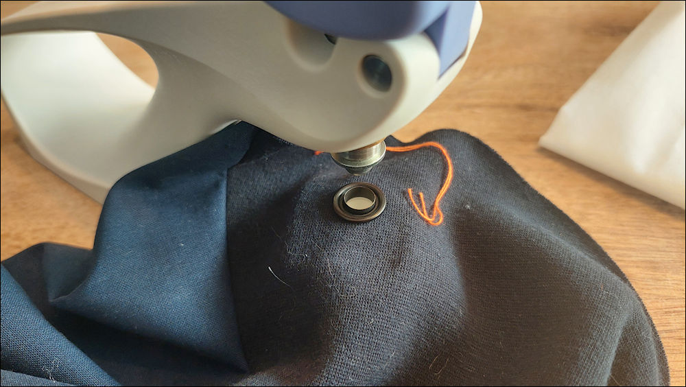De stof er tussen plaatsen, en de ring er boven op, let op hoe je de ring plaats, de kant van de gleuf, die zit onderaan. En duw op de hendel.