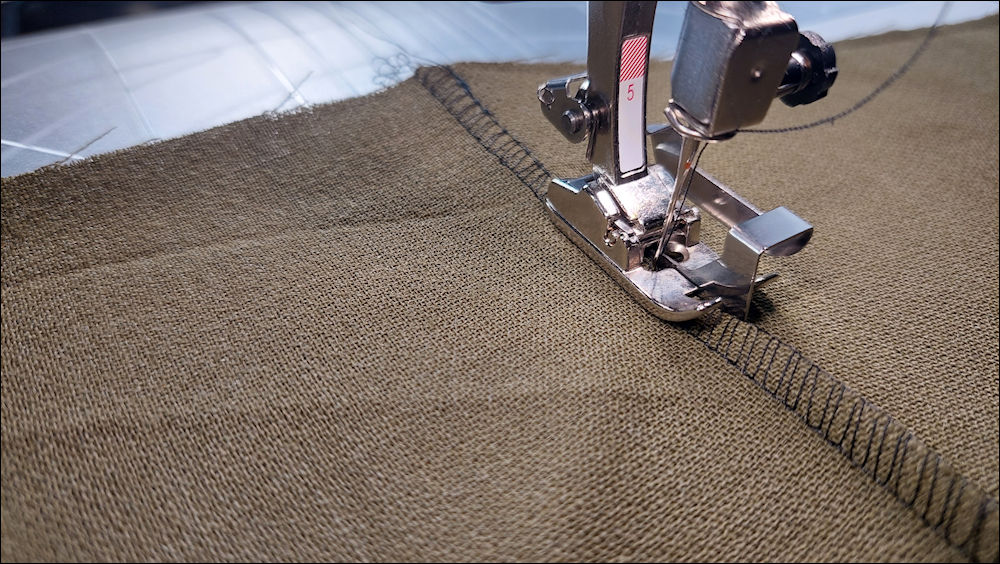 De VERKEERDE kanten op elkaar en overlocken met 1 naald (op voorbeeld is het met de rechternaald), ik heb Serafil genomen als voorbeeld, maar je kan evengoed iets anders nemen dat dikker is van draad. Je kan ook verschillende kleuren nemen om een speelser effect te creeëren.