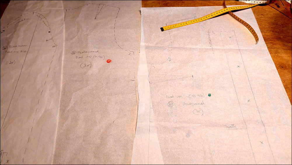 Eerst alles overnemen van de patroonbladen en daarna de patroondelen van elkaar knippen met voldoende papier rondom, zodat je nog kan aanpassen en de naadwaarden nog kan bijtekenen. Als voorbeeld heb ik een trenchcoat genomen.