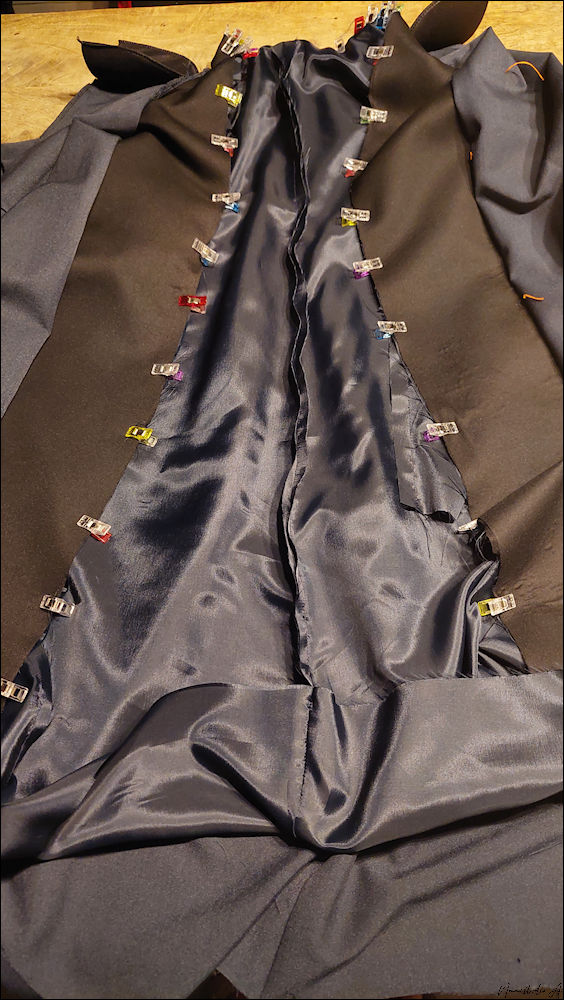 1ste stap: We gaan de goede kant van de jas op de goede kant van de voering vast spelden of met wonderclips. Enkel het beleg vast naaien. Daarna gaan we de mouwen dichtnaaien.