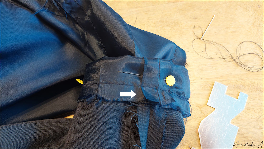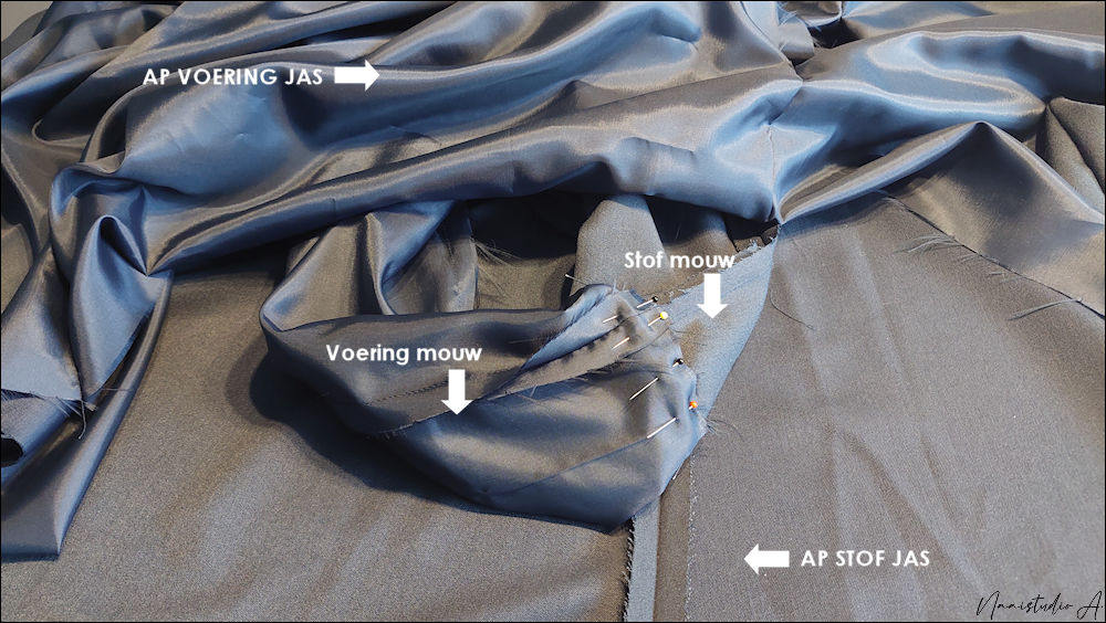 OPGELET: zie dat je voering NIET gedraaid zit, en alle naden zitten op elkaar. (dit is een tweedelige-mouw)