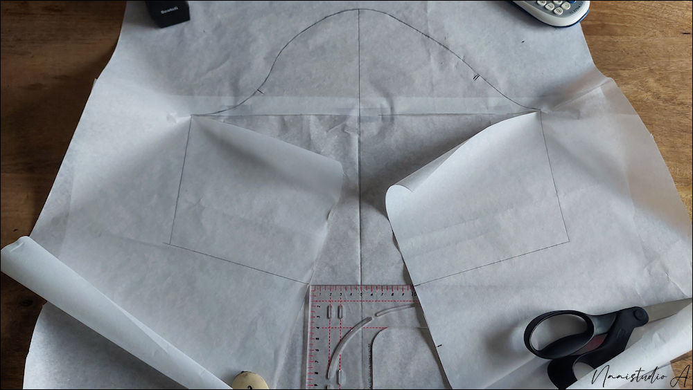 Knip tot aan de horizontale loodlijn, daarna knippen in beide richtingen tot aan het armsgat. Daar waar de oksel zit. Schuif er een ander patroonblad onder en kleef het bovenste deel vast aan het patroon.