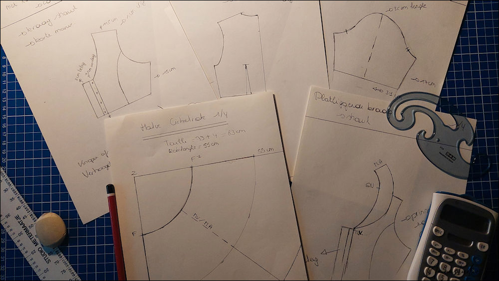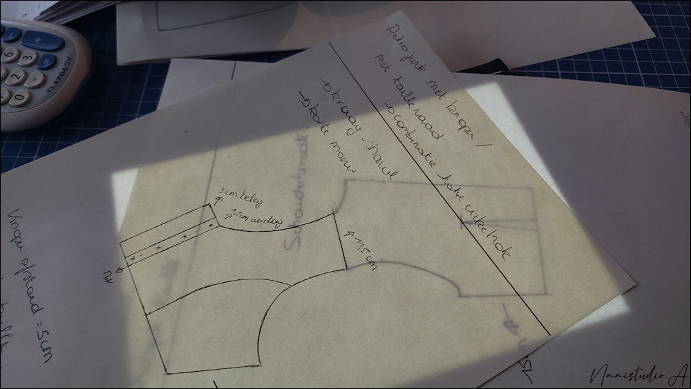 Hierbij het voorlopige patroon met meer ruimte in het midden en onderaan om te rimpelen, eerst nog een proefmodel maken voor nog eventuele wijzigingen. Maak er een knippatroon van en voeg overal 1.5 cm naadwaarde toe, of wat je gemakkelijk vindt. 1 cm is net iets te weinig als je nog wil locken.