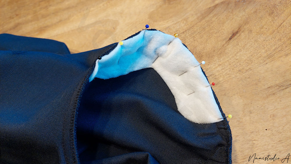 De snor bij de inzetnaad naaien bij het midden van de snor op de schoudernaad en IN de mouw. Dan pas de schoudervulling naaien.