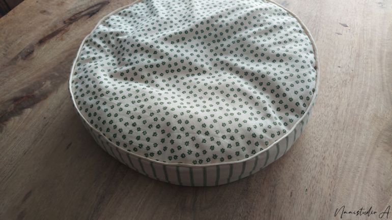 Stel je wil een rond kussen maken op maat. Je wilt een kussen maken van 45 cm diameter met een hoogte van 8 cm. (zie foto)