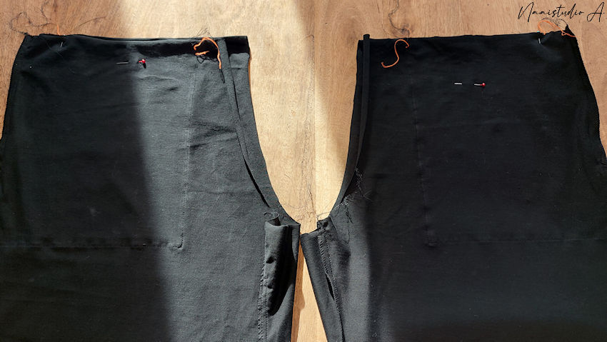 We gaan enkel de broekspijpen aan elkaar naaien, het voorgaande is reeds gedaan: de zakken opgestikt, de zijnaden en binnenbeennaden zijn aan elkaar gestikt.
