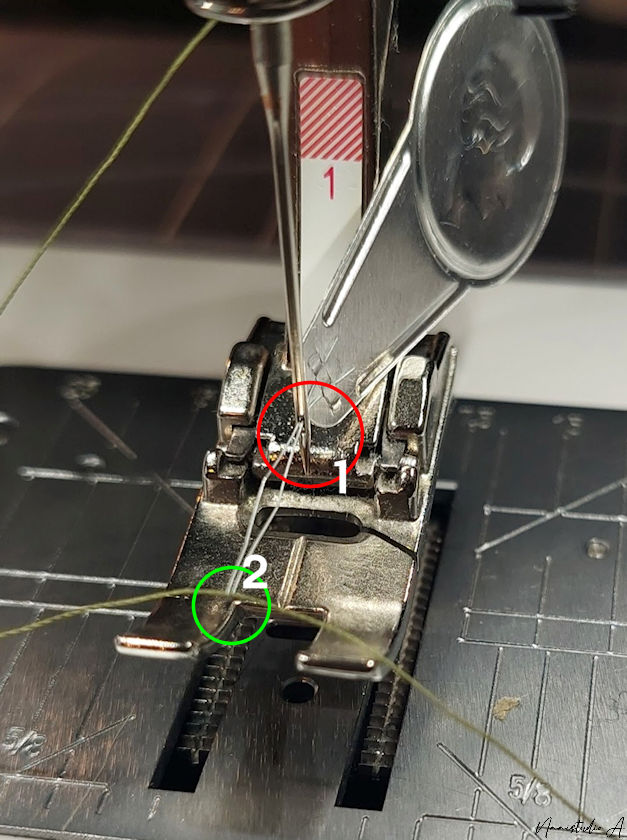 Bij de naaimachine, eerst het ijzerdraadje door de naald steken, dan draad doorheen het ijzertje en doortrekken en klaar!
