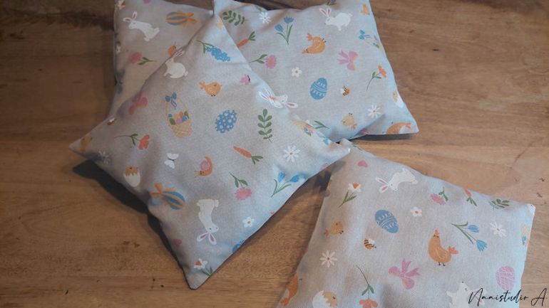 Verschillende kussens in een Paas-jasje. Het is een thema-kussen, ze zijn ongeveer 30×30 cm. Goed om bij de andere kussens te plaatsen in de zetel bijvoorbeeld.