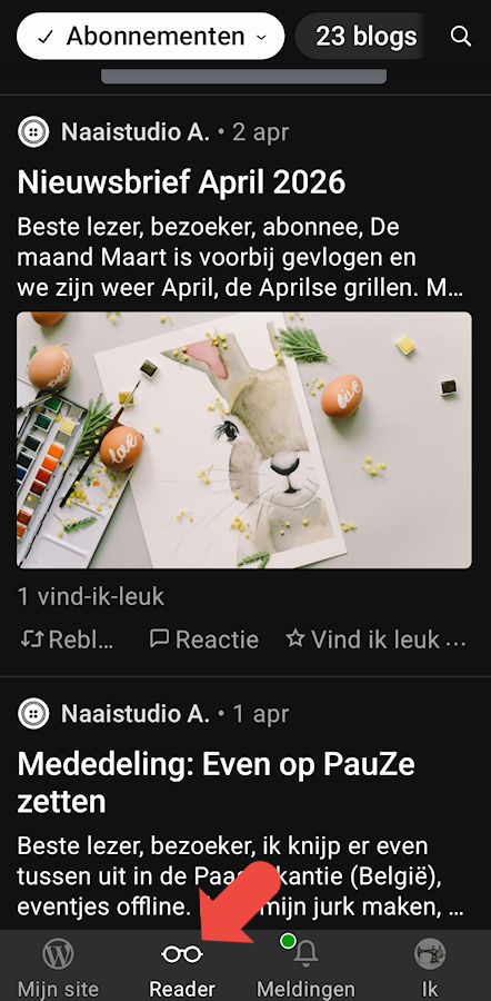 Vanuit je postvak kan je ook de blogberichten lezen en ook via de reader, als je via de reader wilt lezen opent zich automatisch de app van Jetpack van je tablet/smartphone . Lezen op de blog of reader staat in de rechterbovenhoek van je mail dat je van mij hebt gekregen of van een blog dat je volgt. Er zijn heel wat websites die gebruik maken van WordPress.